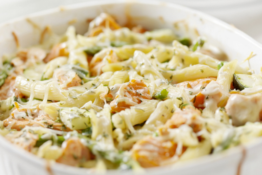 Penne met zalm en doperwtjes in romige aardappelsaus