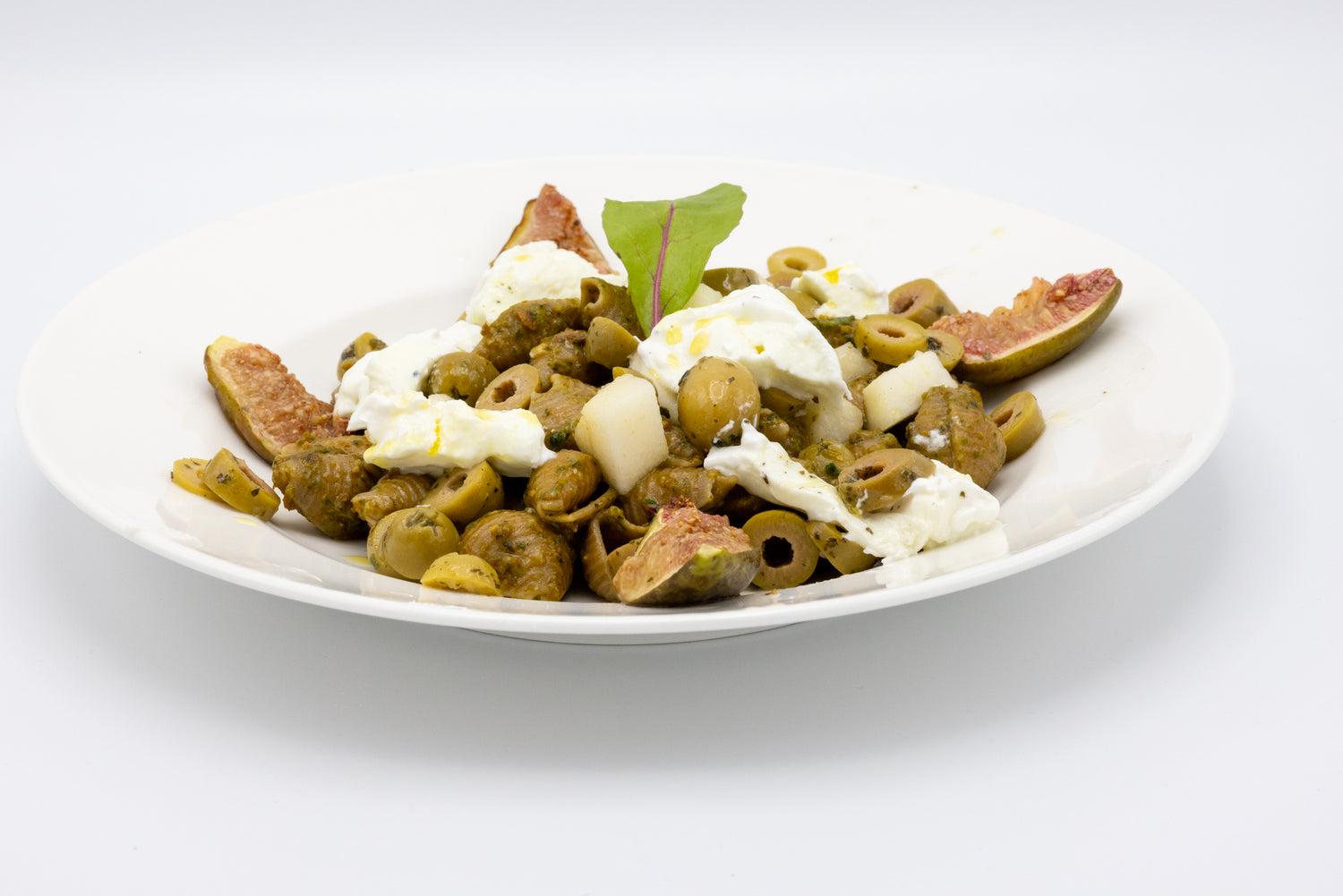 Feestelijke kerst pasta met een Pesto van Basilicum, Gedroogde tomaatjes en Mesclun. Mesclun geeft de pesto een wat bittere ondertoon die heerlijk afsteekt tegen de zoete vijgen, peer en de Burrata.