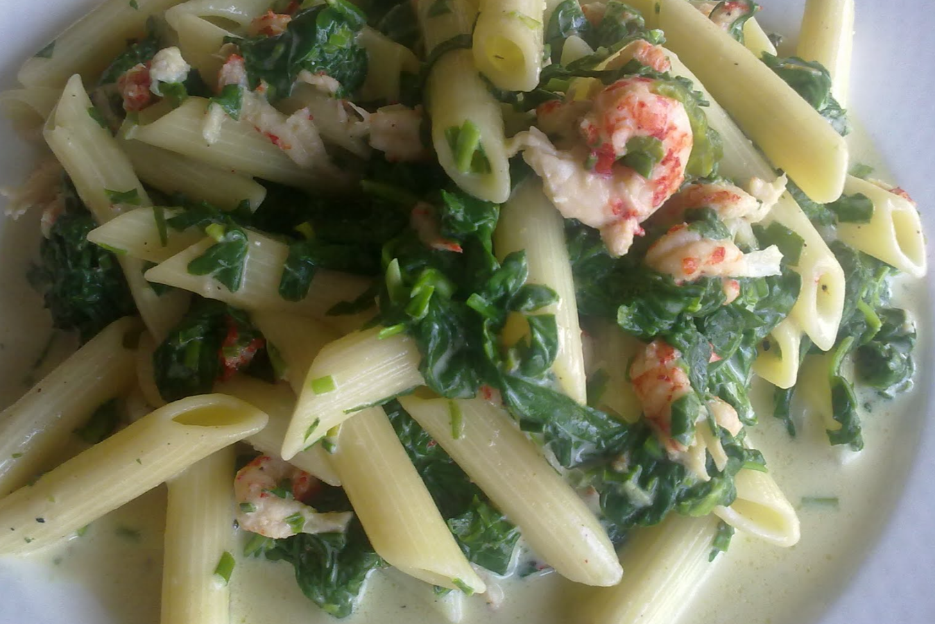 Fris romige citroen - garnalen pasta met spinazie en pijnboompitten